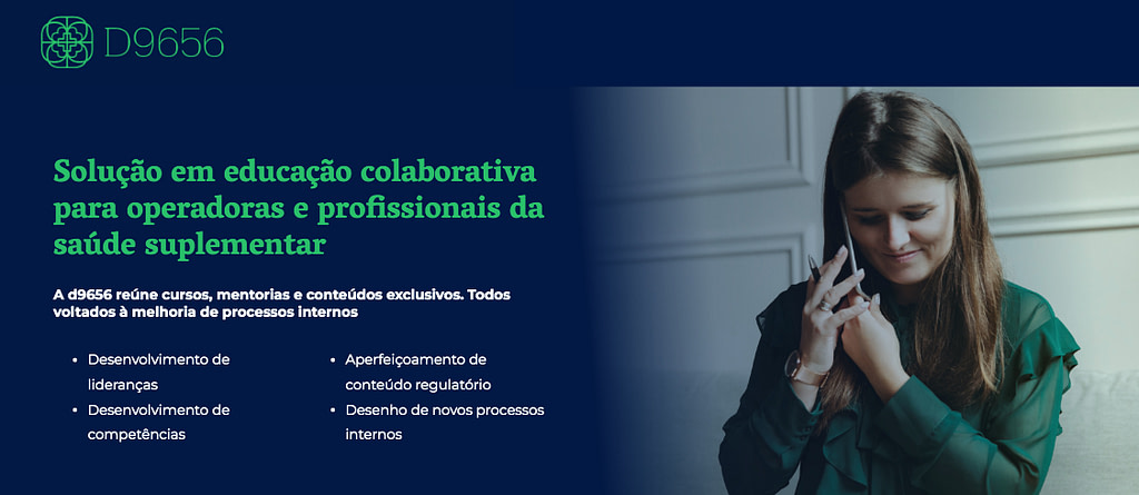 A D9656 edTech, fundada em 2019, nasceu com a missão de simplificar o intricado processo regulatório da Agência Nacional de Saúde – ANS. Nesse sentido, dispõe de uma série de cursos, mentorias e consultorias especificamente voltados à melhoria de processos internos, neutralização do risco regulatório, alinhados a legislação vigente. Através de uma educação colaborativa, busca desenvolver indivíduos e empresas. Atualmente, oferece cursos em diversos setores da saúde, tais como: autogestão, cooperativa odontológica e médica, medicina e odontologia de grupo, Healthtech, entre outros.